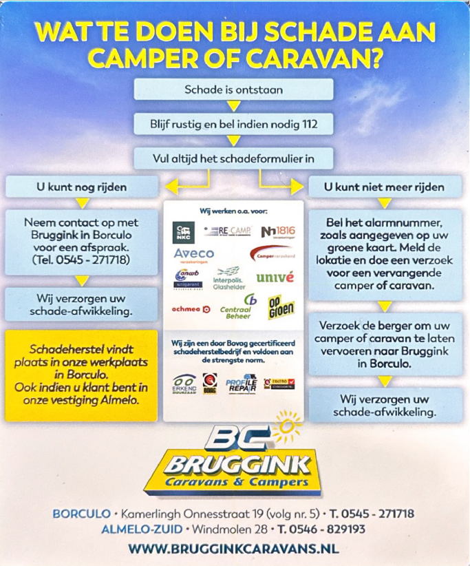 Zowel de genoemde verzekeringsmaatschappijen als Bruggink Caravans & Campers nemen dan de overige zaken uit handen, waardoor het proces voor u kinderlijk eenvoudig is.